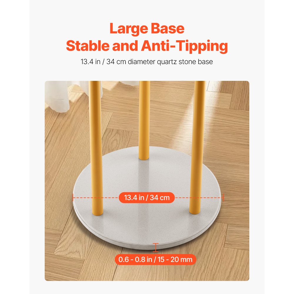 Estable y antivuelco: Este perchero cuenta con una base de piedra de cuarzo estable y duradera de 340 mm, que proporciona una base sólida que evita que se vuelque. Combinado con su varilla principal de acero al carbono engrosada y sus almohadillas inferiores antideslizantes, garantiza una estabilidad fiable al cargar abrigos, sombreros, corbatas y bolsos