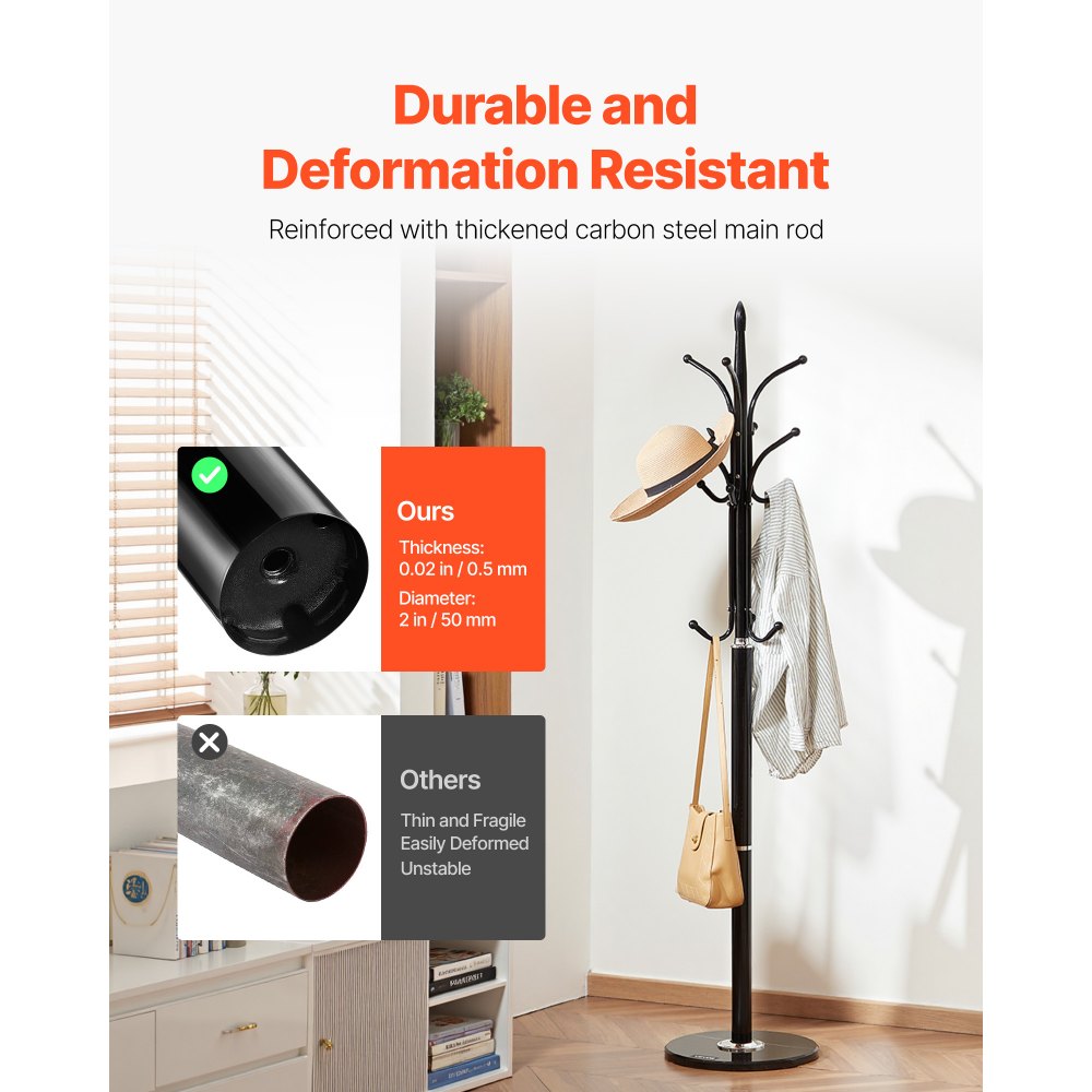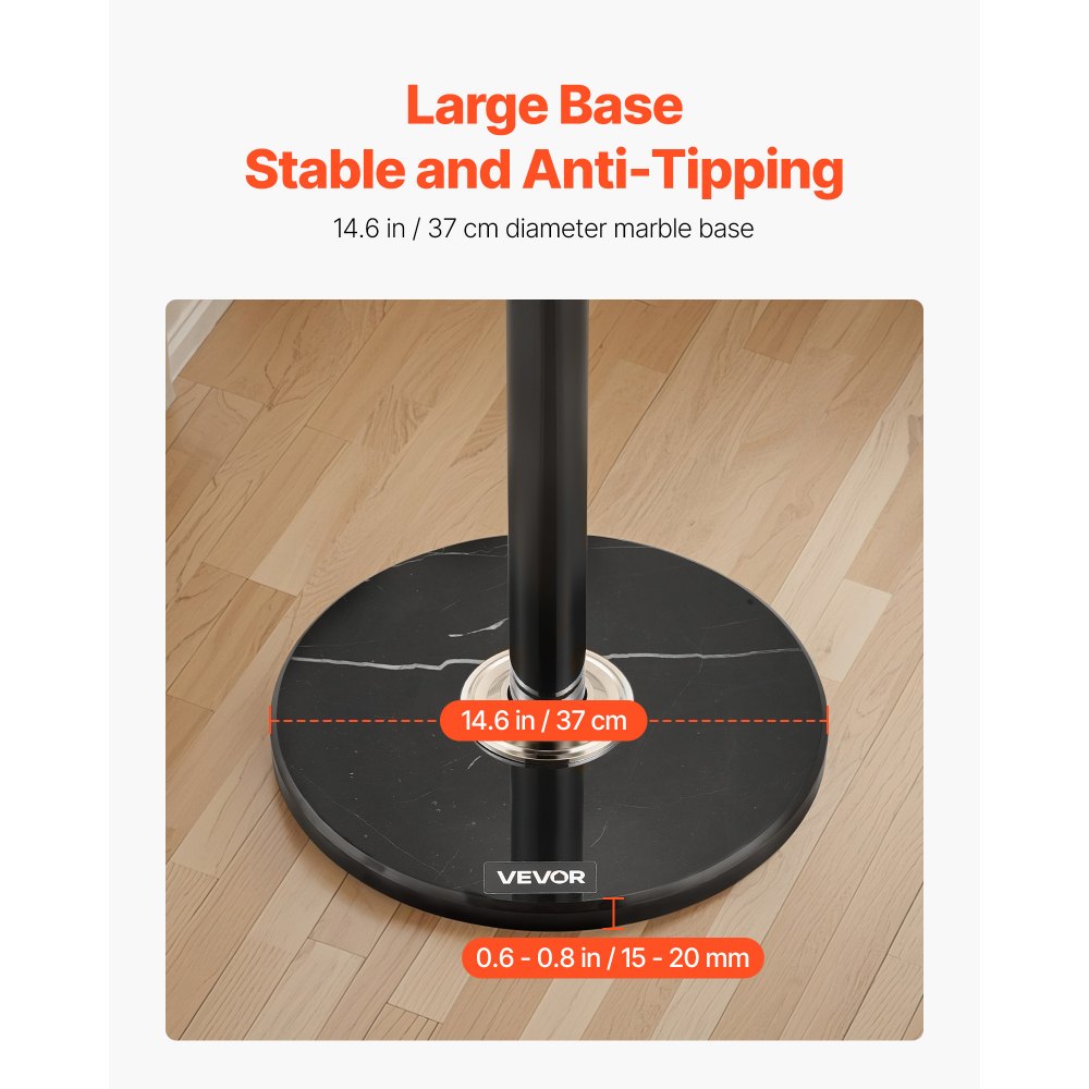 Estable y antivuelco: Este perchero cuenta con una base de mármol estable de 370 mm, que proporciona una base sólida que evita que se vuelque. Combinado con su varilla principal de acero al carbono engrosada y sus almohadillas inferiores antideslizantes, garantiza una estabilidad fiable al cargar abrigos, sombreros, corbatas y bolsos