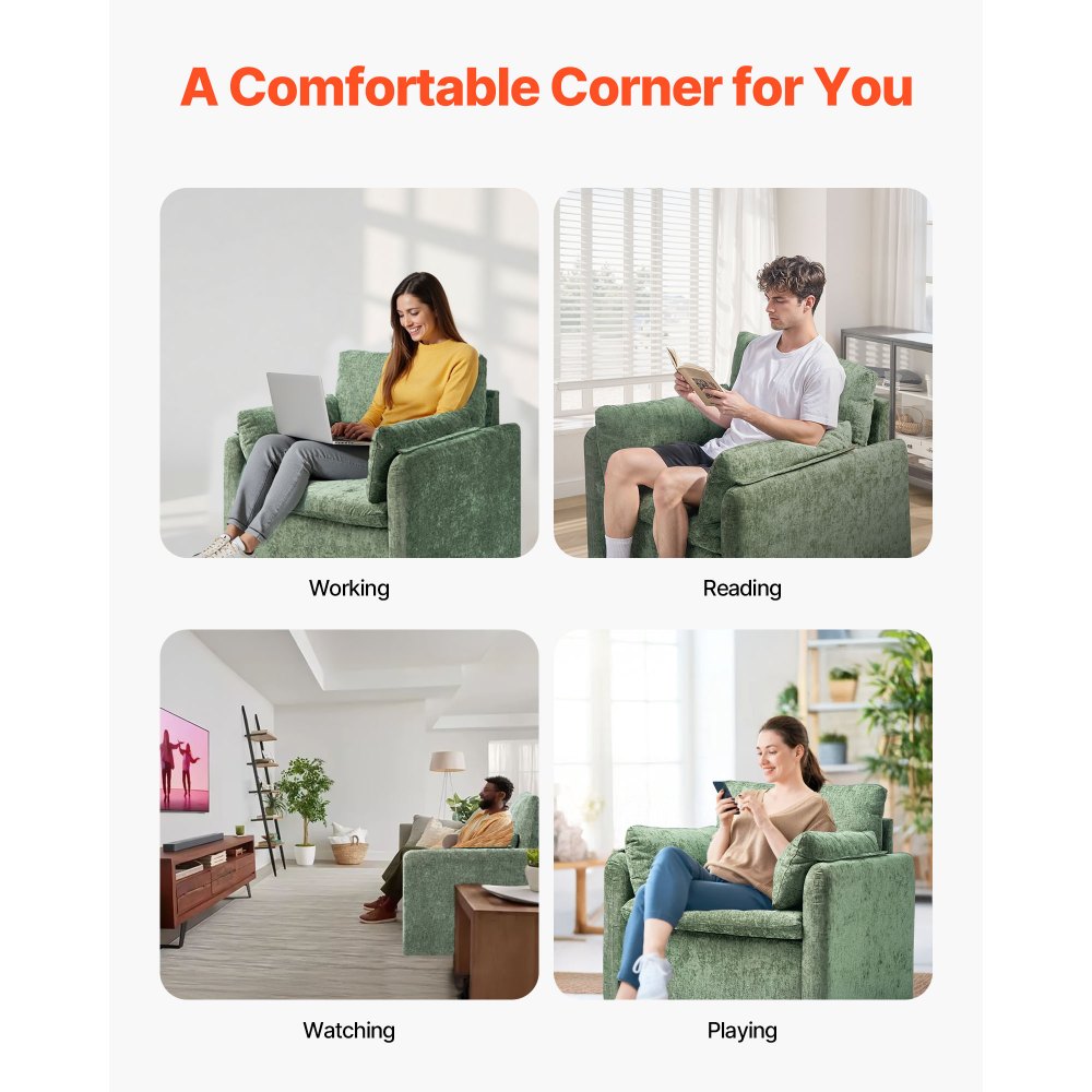 Sillón Moderno con Reposabrazos Tapizado en Tela con Cojín Grueso y Respaldo de 444,5 mm Silla Decorativa Cómoda y Elegante para Salón, Dormitorio, Estudio, Oficina, Sala de Estar, Verde