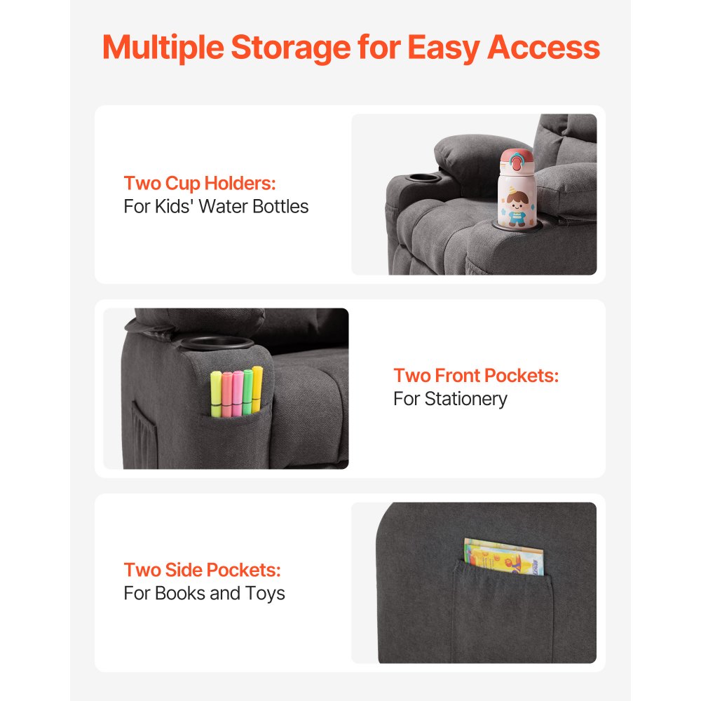 Diseño de almacenamiento conveniente: El sillón reclinable para niños pequeños incluye múltiples funciones de almacenamiento: portavasos para guardar bebidas de forma segura, un bolsillo lateral grande para libros o juguetes y un pequeño bolsillo frontal para bolígrafos y artículos de papelería