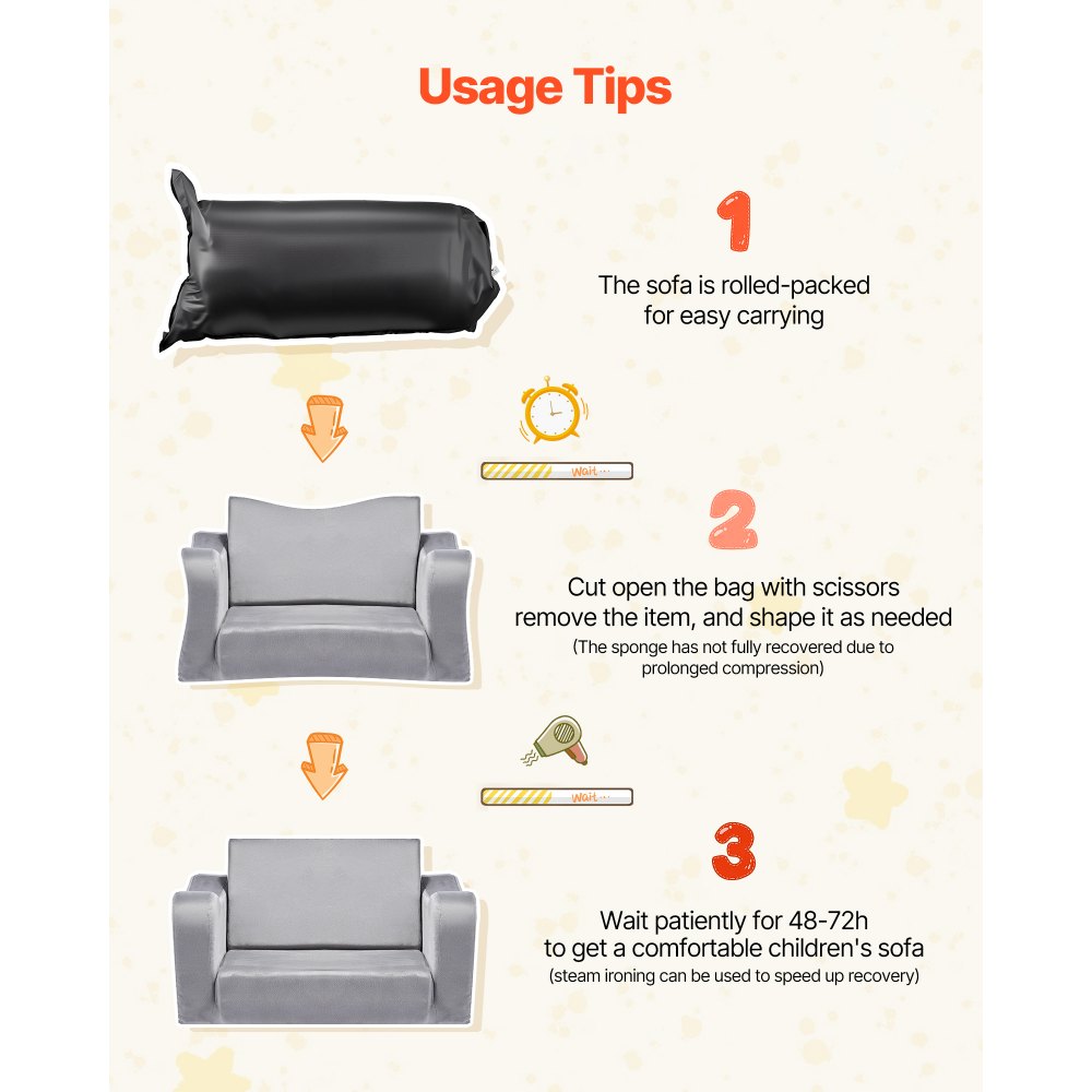 Consejo: Nuestro sofá infantil viene envasado al vacío para facilitar su envío. Debido a la compresión, la espuma interior puede tardar más de 48 horas en expandirse por completo y recuperar su forma original después de desembalarlo. Agradecemos su paciencia; la espera vale la pena