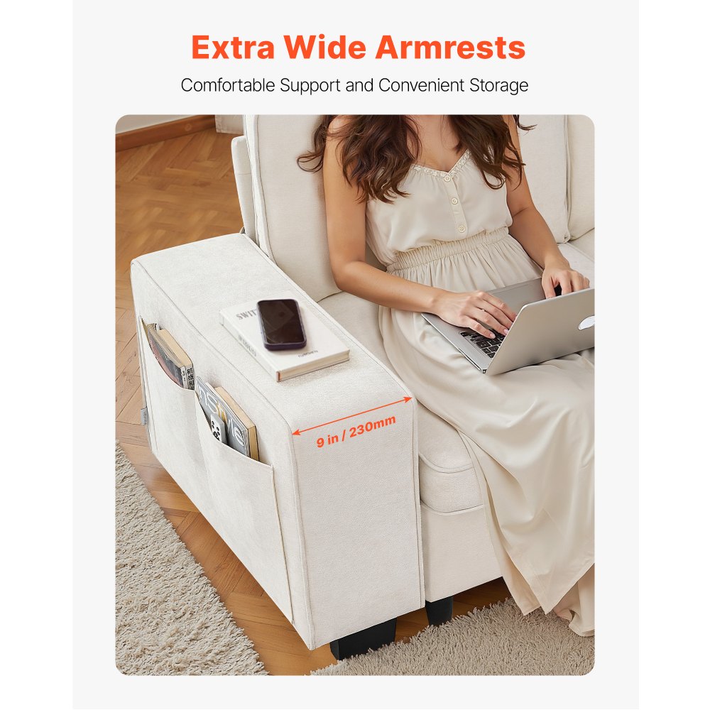 Sofá Modular de 3 Plazas, con Espacio de Almacenamiento Inferior, Moderno Sofá Nube 813 x 2540 x 910 mm con Bolsillos Laterales y Estructura de Metal, para Salón, Apartamento y Oficina, Blanco - Material de oficina