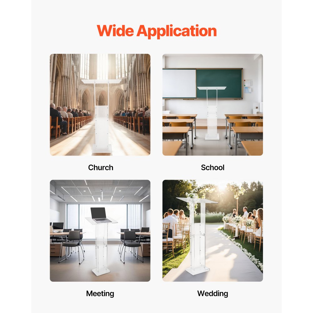 Construcción acrílica duradera: Este atril está fabricado con acrílico resistente que resiste el uso frecuente. Su base proporciona estabilidad y soporte, ofreciendo a los oradores una plataforma fiable para presentaciones con confianza