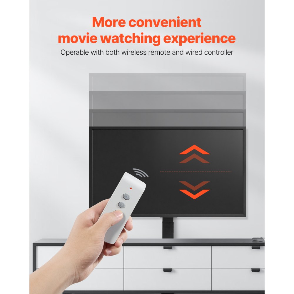Elevación continuamente ajustable: Nuestro mecanismo de elevación de TV tiene una altura de elevación de 645 mm, por lo que puede ajustar fácilmente la altura dentro de este rango para encontrar la altura de visualización ideal. Puede operar el soporte con un control remoto inalámbrico o un controlador manual con cable, lo que permite un control flexible desde cualquier distancia