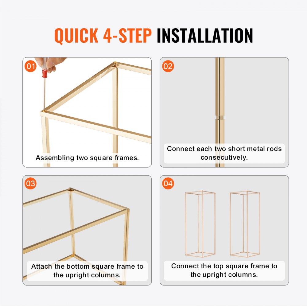 Fácil montaje: El montaje de este puesto de flores para bodas es muy sencillo y no requiere herramientas. Simplemente siga estos 4 pasos: Paso 1: Comience instalando los dos marcos cuadrados. Paso 2: Ensamble las dos varillas de metal más pequeñas una por una. Paso 3: Conecte el marco cuadrado inferior a las columnas. Paso 4: Conecta el marco cuadrado superior a las columnas. Puede completar el montaje en solo unos minutos.