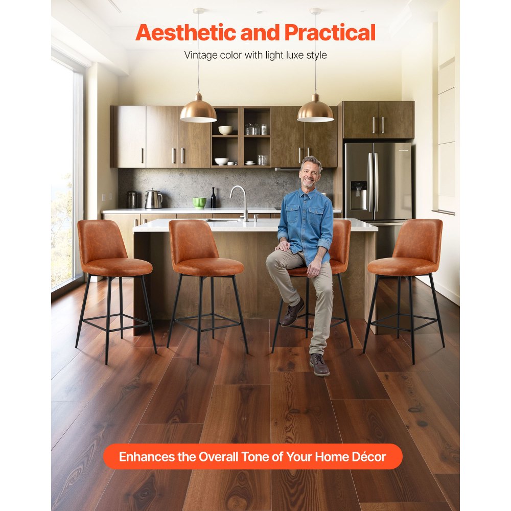 Ligereza y versatilidad: El cuero sintético marrón vintage, combinado con el respaldo estilizado y curvado, lo hace ideal tanto para espacios residenciales como comerciales. La altura estándar del asiento se adapta a diversas barras de bar e islas de cocina