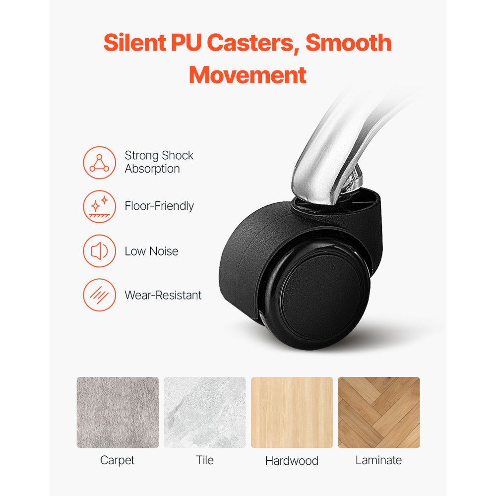 Ruedas silenciosas de PU: Equipado con cinco ruedas de PU giratorias de 360°, nuestro taburete de salón se mueve suave y silenciosamente en el área de trabajo sin crear molestos ruidos de fricción. Las ruedas no dejan marcas antiestéticas en el piso y son adecuadas para una variedad de superficies, incluidas alfombras, baldosas y madera dura