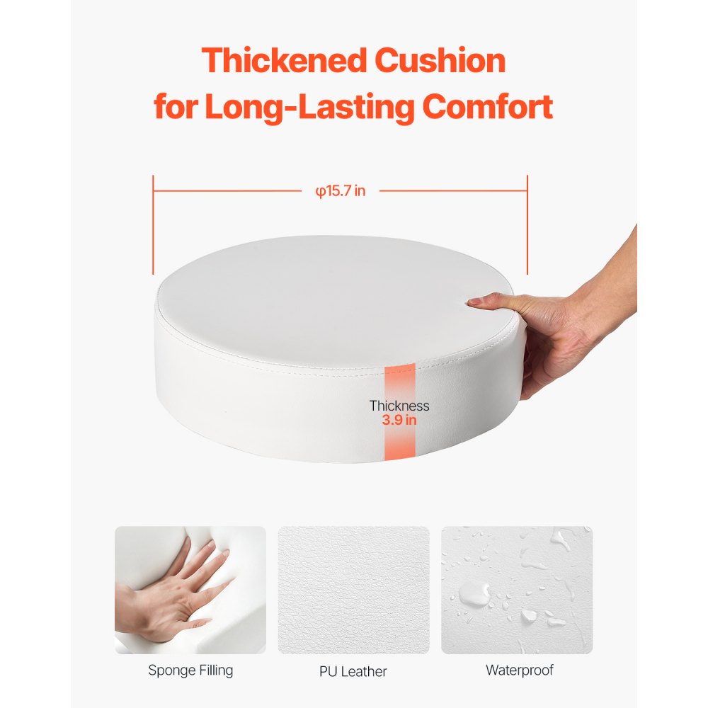 Cojín engrosado: Este taburete con ruedas redondo está hecho de espuma comprimida de alta densidad y tiene un tamaño de cojín de φ15,7 x 3,9 pulgadas (φ39,9 x 9,9 cm), con un grosor aumentado en un 20% para aumentar la comodidad. El asiento de cuero es transpirable, duradero, fácil de limpiar y resistente a la deformación y a la decoloración incluso con un uso prolongado