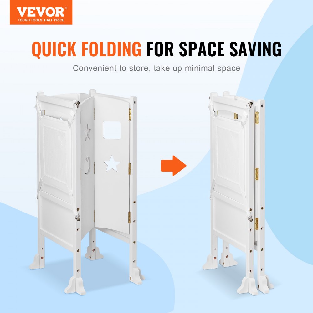 Fomente la independencia, promueva el crecimiento: ¡El taburete plegable para niños pequeños VEVOR es el compañero perfecto para desarrollar la independencia y las habilidades de exploración de los niños! Ya sea en la encimera de la cocina, en el baño o en el dormitorio, es un compañero fiable para las comidas, el lavado de manos y los dientes: ¡una ayuda para el entrenamiento y una torre de aprendizaje esencial!