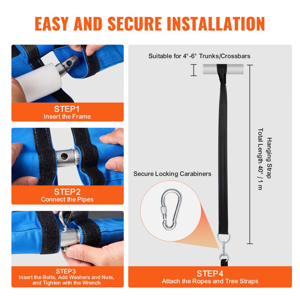 Tela Oxford azul 900D: el asiento del columpio azul está hecho de tela de nailon de alta densidad 900D. Este material duradero es fuerte y puede soportar el uso diario y el desgaste al aire libre, ofreciendo una larga vida útil sin decolorarse. Los tubos del marco están hechos de acero galvanizado con una capa de espuma suave, lo que garantiza la comodidad y la seguridad de los niños. El asiento del columpio tipo platillo está asegurado con cuatro pernos de acero galvanizado con tensión uniforme que resisten el óxido y mantienen el columpio estable.
