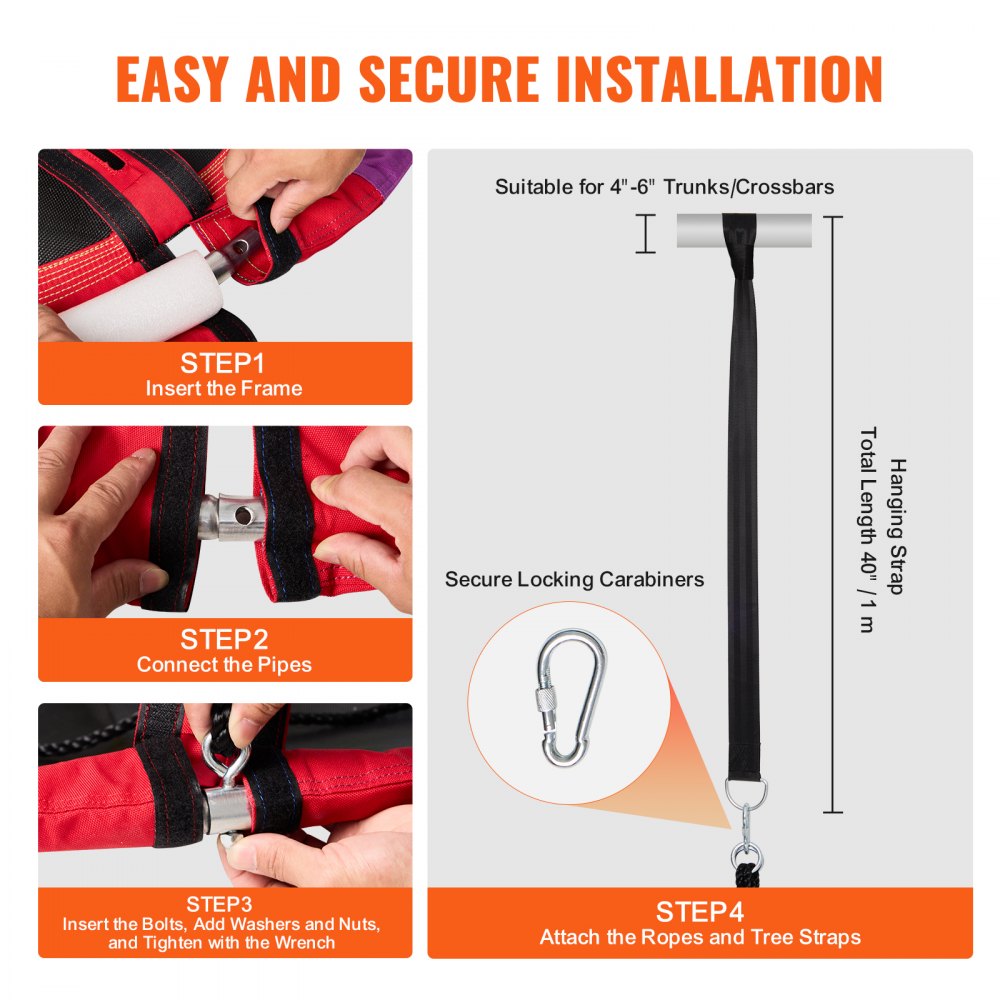Tela Oxford multicolor 900D: el asiento del columpio de color arcoíris está hecho de tela de nailon de alta densidad 900D. Este material duradero es fuerte y puede soportar el uso diario y el desgaste al aire libre, ofreciendo una larga vida útil sin decolorarse. Los tubos del marco están hechos de acero galvanizado con una capa de espuma suave, lo que garantiza la comodidad y la seguridad de los niños. El asiento del columpio tipo platillo está asegurado con cuatro pernos de acero galvanizado con tensión uniforme que resisten el óxido y mantienen el columpio estable.