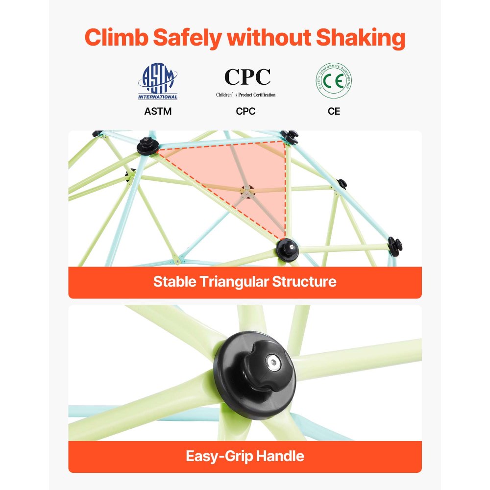 Estructura robusta y estable: Construida con tubos de acero engrosados y una estructura triangular estable, esta cúpula para escalar para niños se mantiene estable y segura, sin tambalearse ni volcarse mientras los niños trepan. El colorido revestimiento de zinc es atractivo y ofrece una gran resistencia a la oxidación y la corrosión