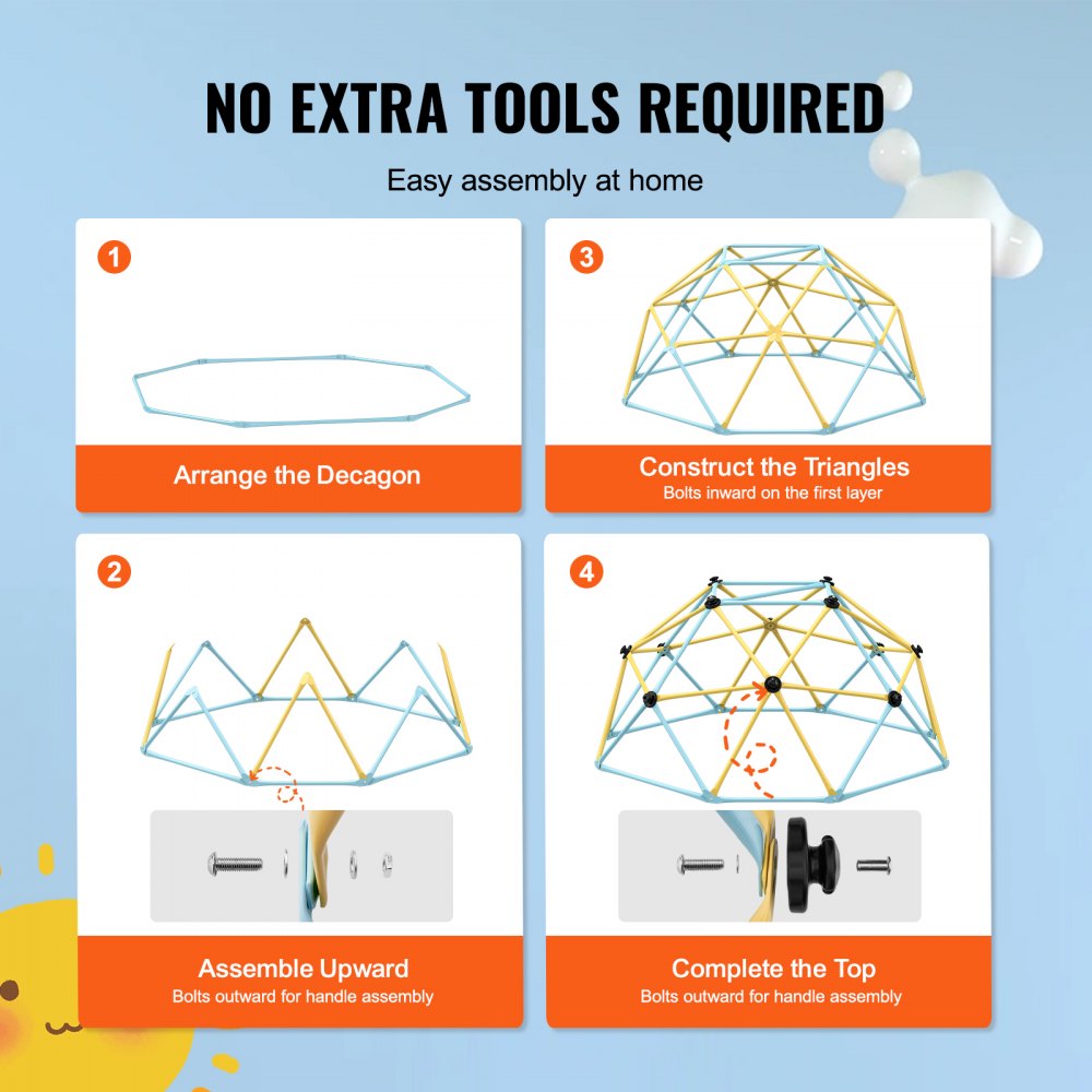Configuración sencilla: se incluye todo lo que necesita, desde herramientas de instalación hasta manuales detallados y guías en vídeo. Nuestras instrucciones claras lo guiarán sin esfuerzo a través del ensamblaje, permitiéndole crear rápidamente un área de juegos divertida para sus hijos con nuestro domo de escalada para niños.