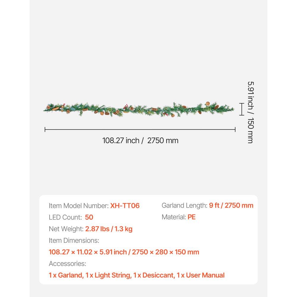 Tamaño y diseño: Esta guirnalda navideña presenta una mezcla realista de agujas de pino, 4 piñas redondas, 9 piñas largas y 4 racimos de bayas, creando una apariencia completa y realista que trae la belleza de la naturaleza a su hogar