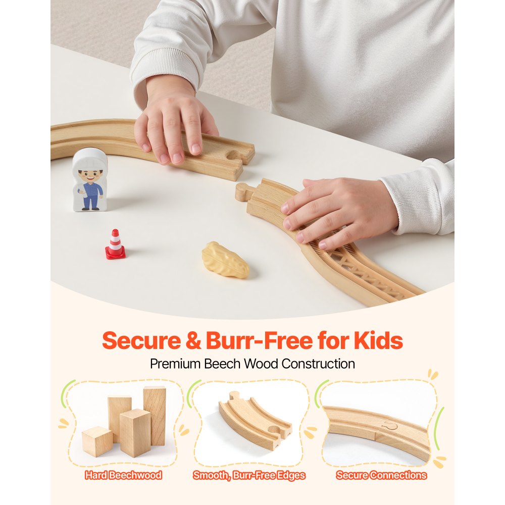 La seguridad es lo primero: Fabricado con madera de haya de calidad con bordes lisos y sin rebabas. El juego de vías de tren de madera es suave para las manos de los más pequeños, con conexiones firmes y trenes de marcha suave, diseñados para años de juego