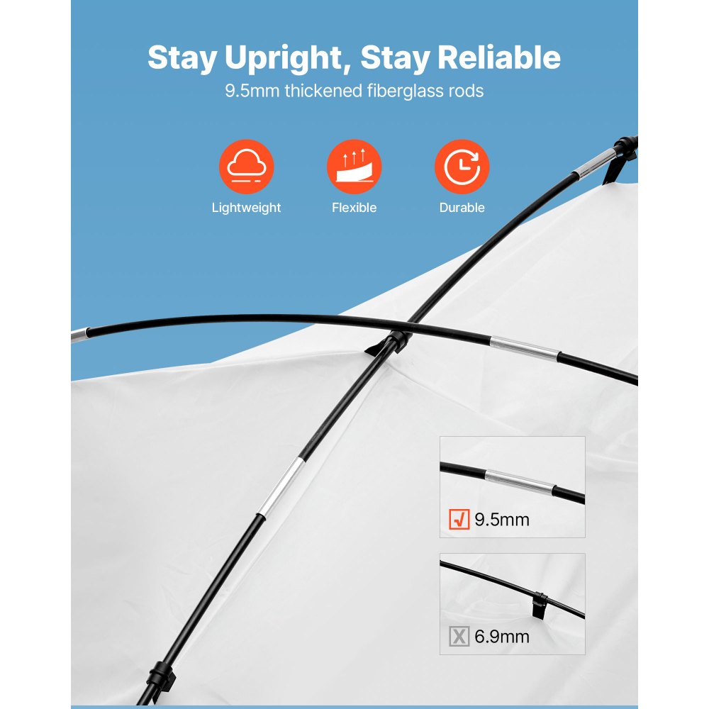 Construcción robusta: Equipada con postes de fibra de vidrio de 9,5 mm de grosor, ganchos resistentes al viento y clavos pulidos, la carpa de pintura se mantiene firme en exteriores. La tela Oxford es repelente al agua y ofrece una protección fiable para sus proyectos de pintura