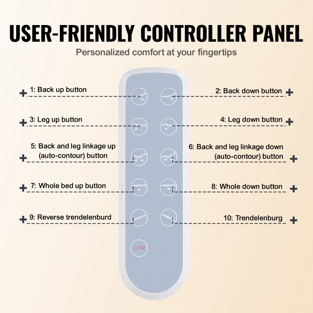 5 Funciones Mejoradas: La cama de hospital eléctrica VEVOR cuenta con 5 funciones ajustables. Personalice fácilmente su posición con ángulos de Trendelenburg y Trendelenburg inverso (0°-12°), elevación completa de la cama (43,1-72,5 cm), ángulo del respaldo (0°-75°) y posición de las piernas (0°-35°) para satisfacer sus necesidades específicas