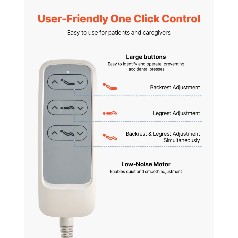 Ajuste eléctrico de 2 funciones: Esta cama de hospital totalmente eléctrica permite ajustar el respaldo de 0 a 75° y las piernas de 0 a 45°. Ya sea que necesite recostarse para descansar o sentarse para leer o ver la televisión, satisface sus necesidades versátiles para facilitar su cuidado diario