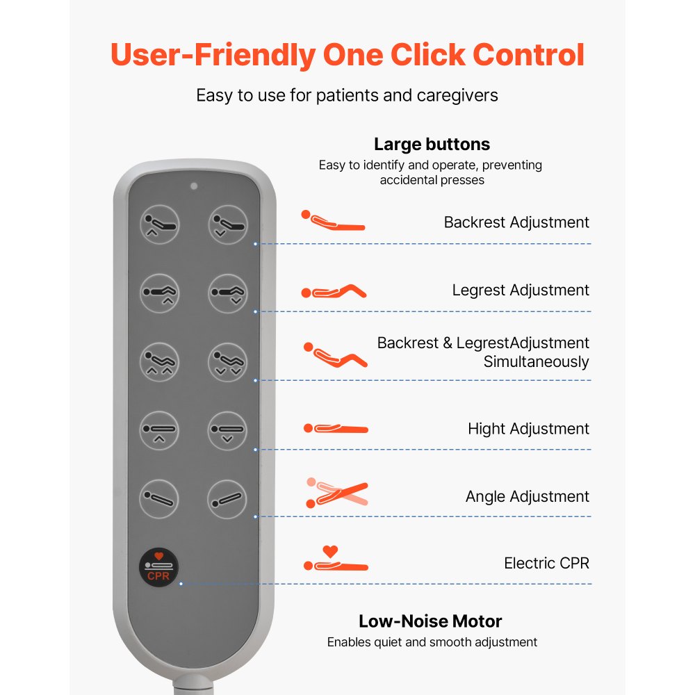 5 funciones y silla cardíaca: Esta cama de hospital completamente eléctrica admite la posición de silla cardíaca, función de RCP, ajuste del respaldo de 0 a 75°, ajuste de piernas de 0 a 45°, altura ajustable de 470 mm a 760 mm, además de posicionamiento Trendelenburg y Trendelenburg inverso