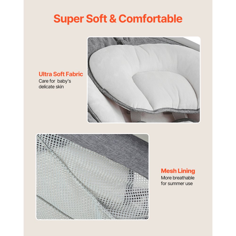 Mejora de la comodidad: Imitando el abrazo de una madre, el reposacabezas y el cojín gruesos y ultra suaves ofrecen una comodidad y seguridad superiores, y son suaves para la delicada piel del bebé. Los cojines desmontables y lavables facilitan la limpieza, y un forro de malla transpirable lo mantiene fresco y refrescante, perfecto para los días de verano. Ofrécele a tu bebé la máxima comodidad en esta acogedora mecedora