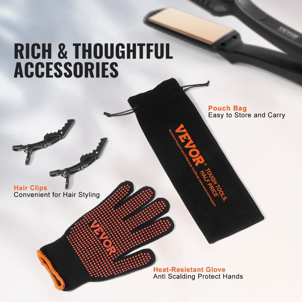 Accesorios bien pensados: Las pinzas para el cabello incluidas sujetan el cabello de forma segura para un peinado rápido y eficiente, y el guante resistente al calor brinda protección adicional para sus manos. Además, la bolsa de terciopelo permite un almacenamiento y portabilidad convenientes, lo que facilita llevar la plancha de pelo a cualquier parte.