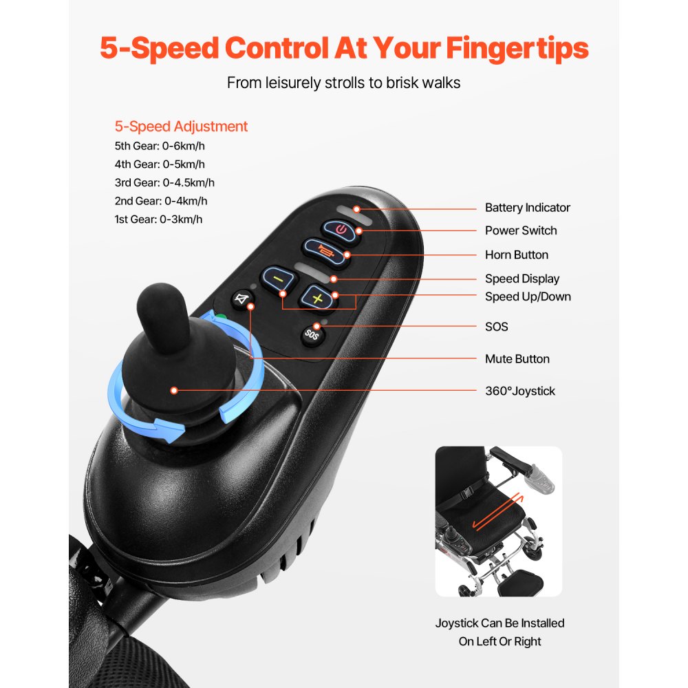 Ajuste de 5 velocidades: Controle fácilmente la velocidad con una sola mano. La palanca de mando es reversible y cuenta con ajuste de 5 velocidades, indicador de batería, interruptor de encendido, botón de bocina y pantalla de velocidad, lo que le ofrece la máxima comodidad