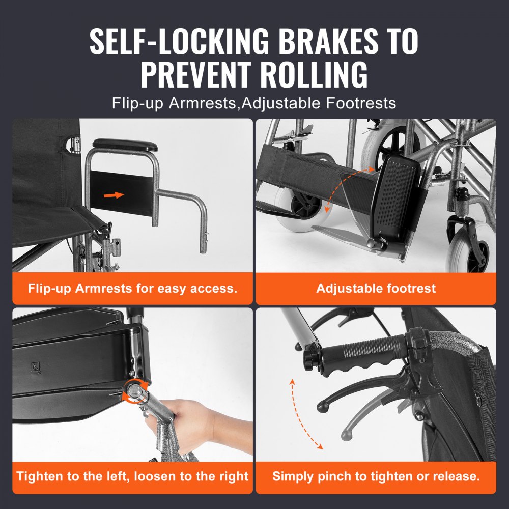 Silla de ruedas VEVOR, silla de transporte de acero al carbono para adultos, silla de ruedas plegable con reposabrazos desmontable, freno autoblocante, asiento de 24 pulgadas de ancho, capacidad de peso de 300 libras, para que las personas discapacitadas se muevan libremente