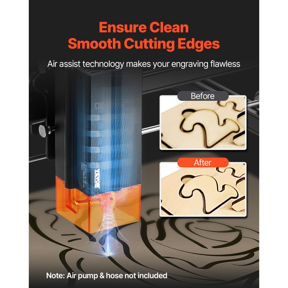 Compatible con bomba de aire: Mejore el rendimiento de corte gracias a la compatibilidad con la bomba de aire. Al combinarse con una bomba de aire, el flujo de aire de alta velocidad mejora la eficiencia de corte, evita los bordes oscuros y proporciona un acabado limpio y liso. Este grabador láser también ayuda a reducir la temperatura de la superficie durante el grabado y el corte, lo que resulta en bordes nítidos y precisos (bomba de aire no incluida)