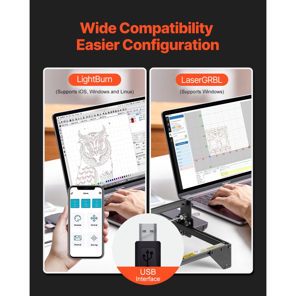 Fácil de usar y compatible: Nuestra máquina de grabado láser para madera ofrece una excelente compatibilidad de software y se conecta a su ordenador mediante USB. Es compatible con los programas de grabado láser más populares, como LightBurn y LaserGRBL (compatible con sistemas iOS, Windows y Linux). Graba una amplia gama de materiales, como madera, ciertos metales, acrílico opaco, vidrio (con revestimiento negro), etc