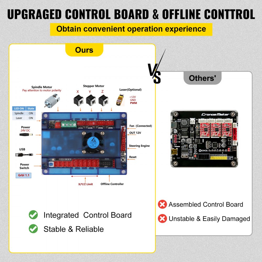 【CONTROL CONVENIENTE】- Conéctese a la computadora a través del puerto USB y sea controlado por GRBL. También se incluye un controlador fuera de línea del enrutador CNC para un fácil control remoto sin una computadora. En comparación con otros controladores fuera de línea de 1", nuestro controlador de 1,8" tiene las siguientes tres ventajas: 1. No es necesario conectarse a una computadora; 2. No es necesario descargar archivos. 3. Ajuste manualmente la posición de los ejes X, Y, Z al punto de inicio del grabado y encienda o apague manualmente el eje.