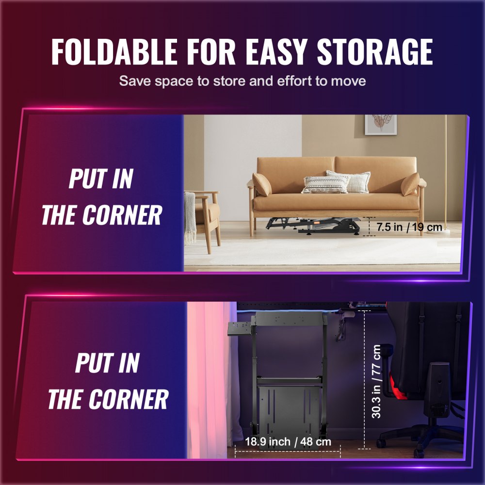Plegable y compacto: Después de disfrutar del juego, puede plegar fácilmente este soporte para volante de carreras y guardarlo debajo de su sofá / cama o en la esquina, lo que lo convierte en una opción perfecta para jugadores con espacio de almacenamiento limitado. El diseño compacto le permite llevarlo a cualquier lugar para mantener su entusiasmo por los juegos con usted.
