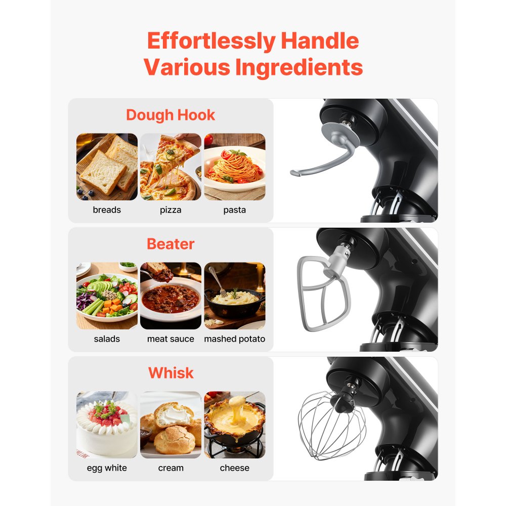 Solución completa para mezclar: Lista para hacer frente a cualquier cosa en la cocina. Nuestra batidora de pie cuenta con 3 accesorios profesionales para mezclar: un gancho para masa para amasar pizza u otra masa pesada sin esfuerzo, un batidor plano para batir puré de papas, masas para pasteles o glaseado, y un batidor para crear mezclas livianas como crema batida esponjosa o claras de huevo