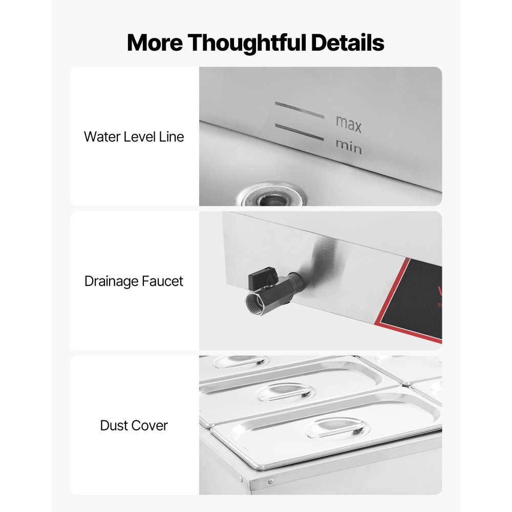 Calentamiento rápido y uniforme: Equipado con una potente resistencia de acero inoxidable de 1500 W, este calentador de alimentos comercial calienta los alimentos rápidamente, conservando su sabor. Puede ajustar la temperatura de 30 a 85 °C para adaptarse a diferentes platos y necesidades de servicio