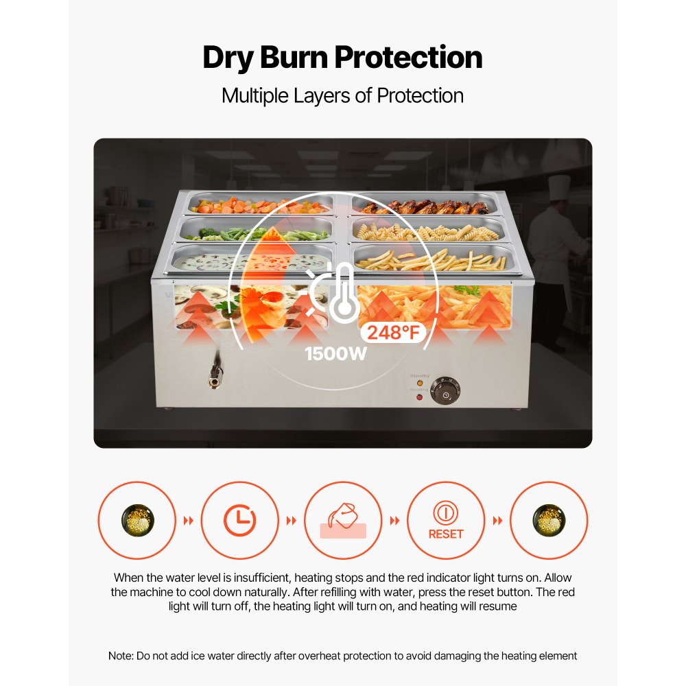 Función de parada inteligente: Cuando la temperatura supera los 120 °C, el calentador de alimentos deja de calentar automáticamente. Para volver a usarlo, rellénelo con agua y presione el botón de reinicio. Evite verter agua helada, ya que puede dañar el tubo de calentamiento