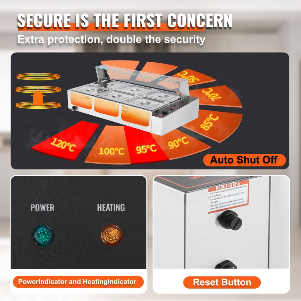 Calentamiento rápido, calidez duradera: este impresionante calentador de alimentos con cubierta de vidrio viene con un potente tubo de calentamiento de acero inoxidable de 1500 vatios que calienta rápidamente la comida para mantenerla caliente y con un delicioso sabor. Puede ajustar la temperatura de salida según sus preferencias, que varía entre 86 y 185 °F/30 y 85 °C, gracias al controlador de temperatura.