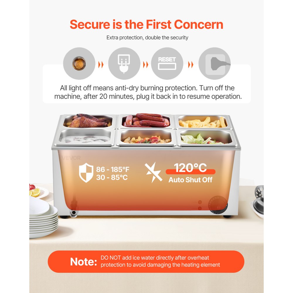 Calentador de alimentos comercial de 6 sartenes VEVOR, mesa de vapor eléctrica de 13,5 l, 1200 W, encimera profesional de acero inoxidable, para bufé, baño María, con control de temperatura de 86 a 185 °F para catering y restaurantes, color plateado - Tecnología