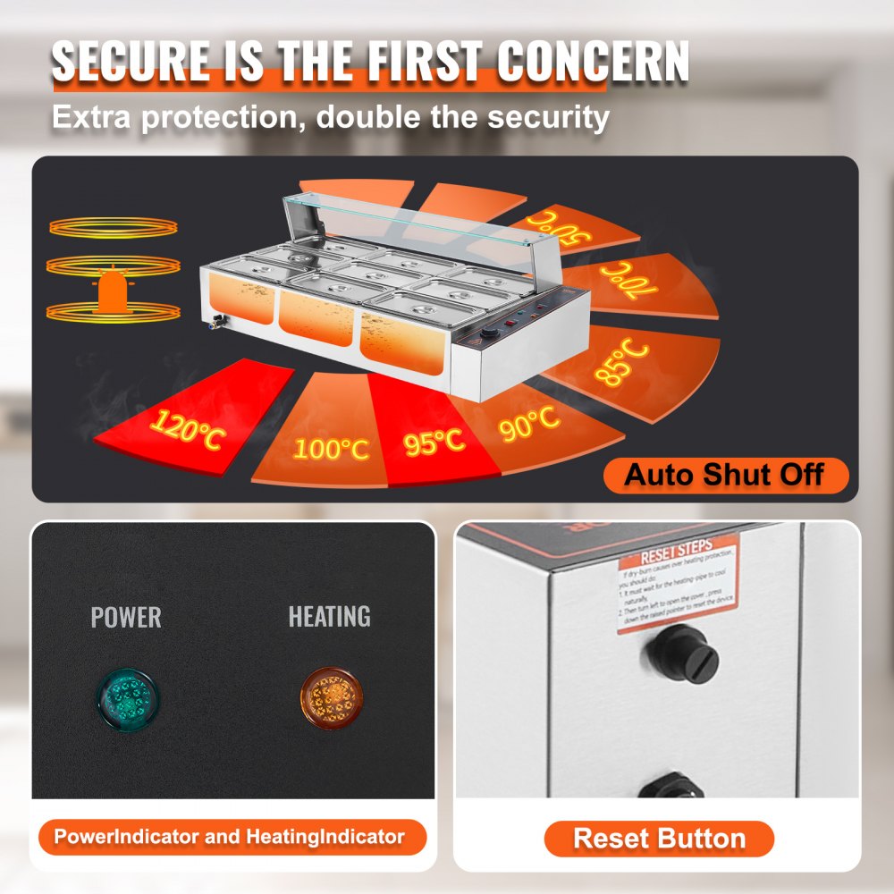 Calentamiento rápido, calidez duradera: este impresionante calentador de alimentos con cubierta de vidrio viene con un potente tubo de calentamiento de acero inoxidable de 1500 vatios que calienta rápidamente la comida para mantenerla caliente y con un delicioso sabor. Puede ajustar la temperatura de salida según sus preferencias, que varía entre 86 y 185 °F/30 y 85 °C, gracias al controlador de temperatura.