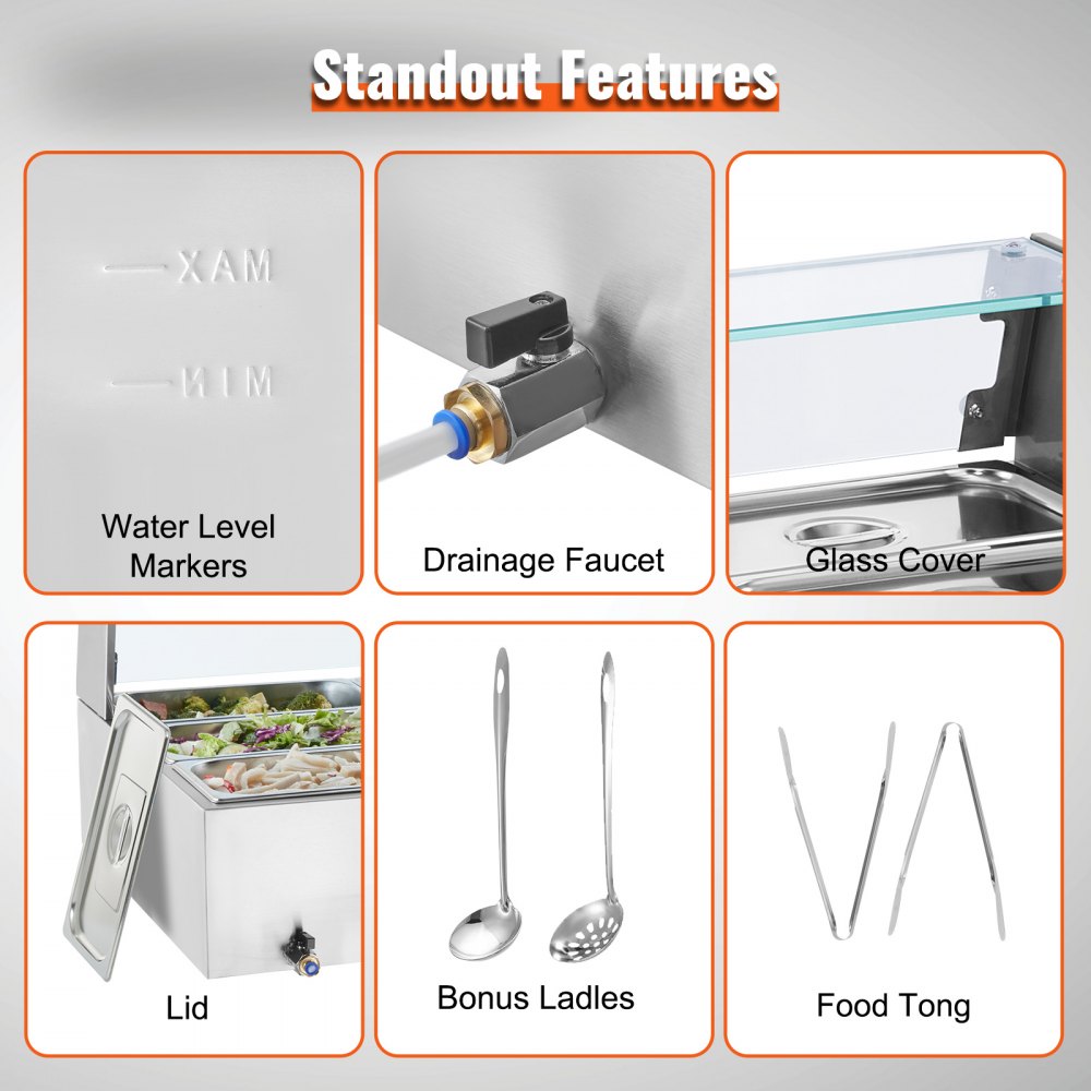 Incluye 9 bandejas: nuestro calentador de alimentos comercial viene con nueve bandejas de 5 cuartos de galón(9 de 1/3 de tamaño) acompañadas de sus respectivas tapas, lo que le permite servir diferentes platos simultáneamente. Siéntase libre de cambiar su menú de sopas y salsas a guisos o incluso queso para nachos y chocolate.