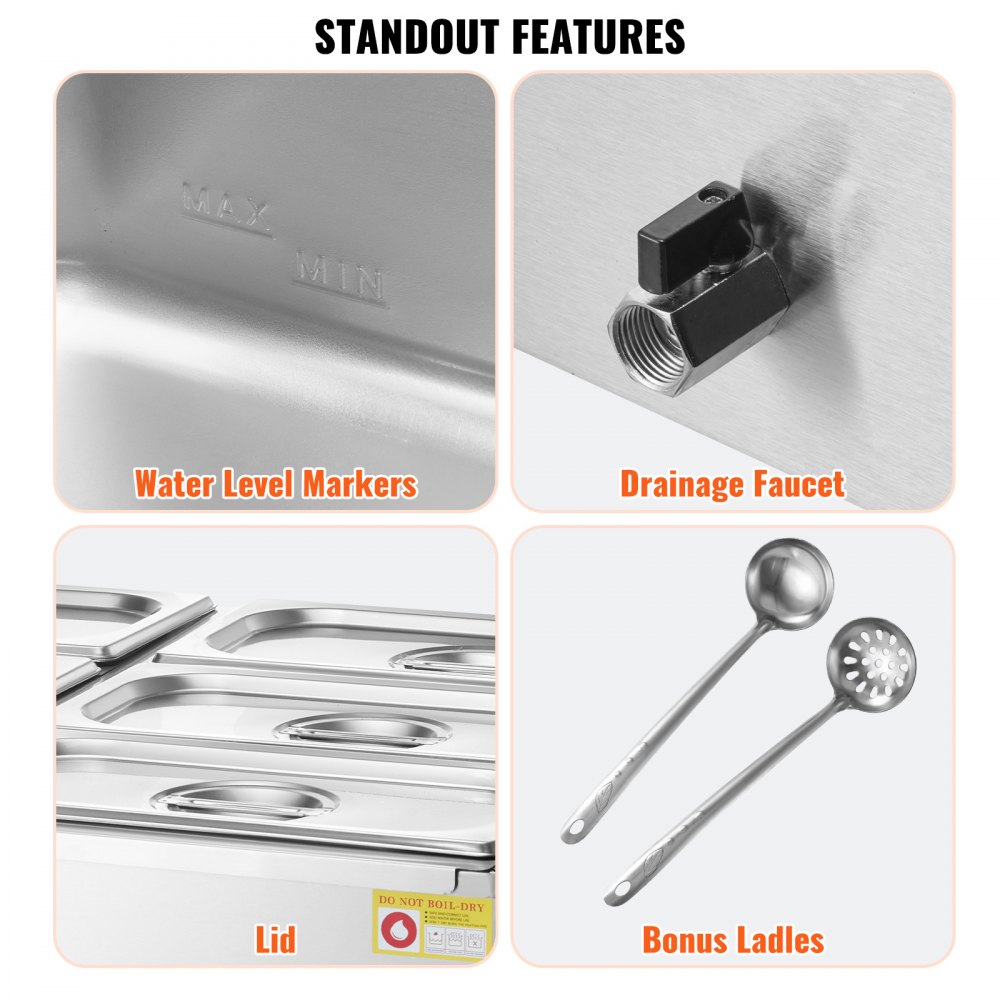 Calentador de alimentos comercial VEVOR de 6 sartenes, mesa de vapor eléctrica de 6 x 5 qt, 1500 W, encimera profesional de acero inoxidable, para bufé, baño María, con control de temperatura de 86 a 185 °F para catering y restaurantes, color plateado - Tecnología