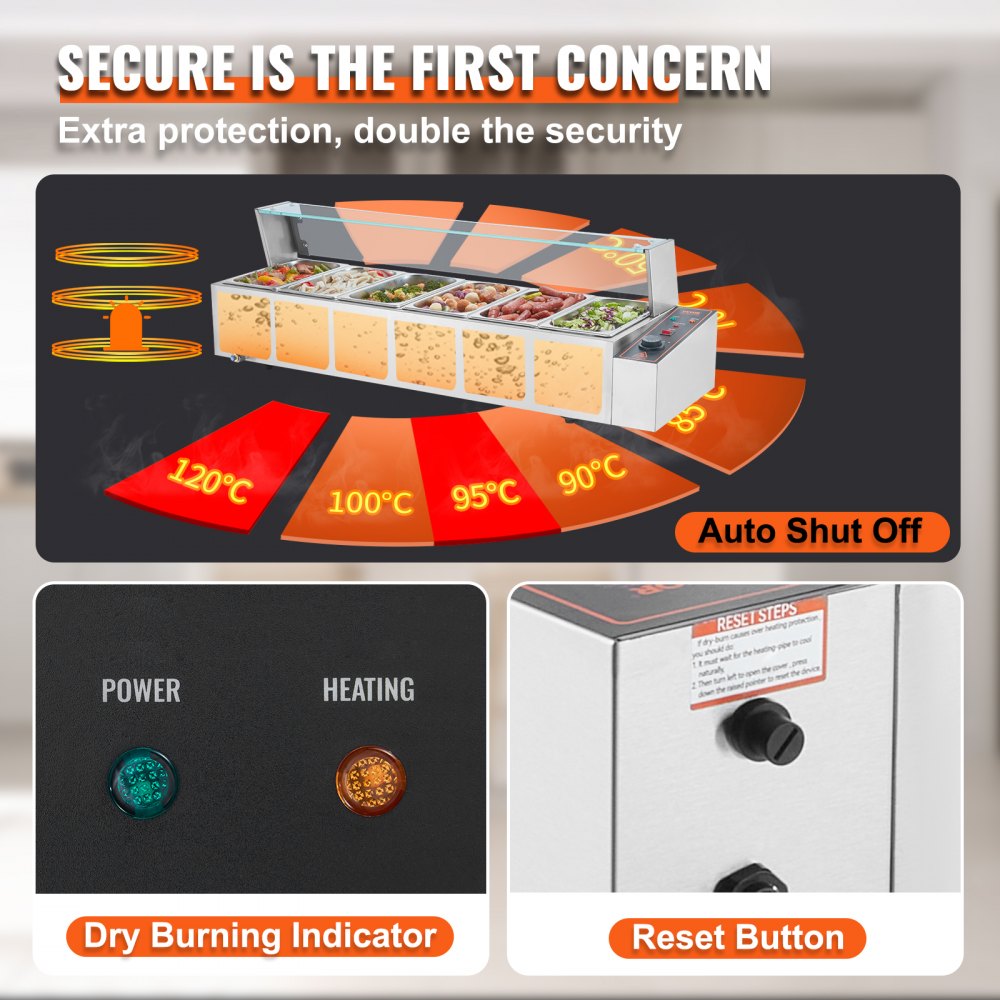 Incluye 6 sartenes: nuestro calentador de alimentos comercial viene con seis sartenes de 5 cuartos de galón(6 de 1/3 de tamaño) acompañadas de sus respectivas tapas, lo que le permite servir diferentes platos simultáneamente. Siéntase libre de cambiar su menú de sopas y salsas a guisos o incluso queso para nachos y chocolate.