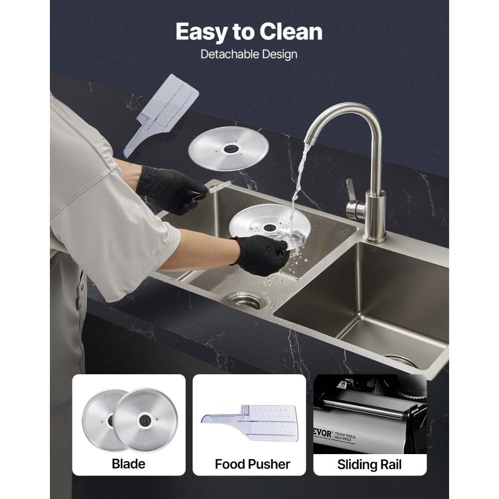 Desmontable para una limpieza fácil: Fabricada con materiales aptos para alimentos en todas las piezas que entran en contacto con los alimentos, nuestra máquina cortadora de carne está diseñada para su comodidad. Cuenta con una bandeja de acero inoxidable que es fácil de limpiar. La cuchilla, la rejilla para alimentos y el empujador de alimentos son fácilmente desmontables, lo que hace que la limpieza posterior al uso sea muy sencilla y mantiene su cocina impecable