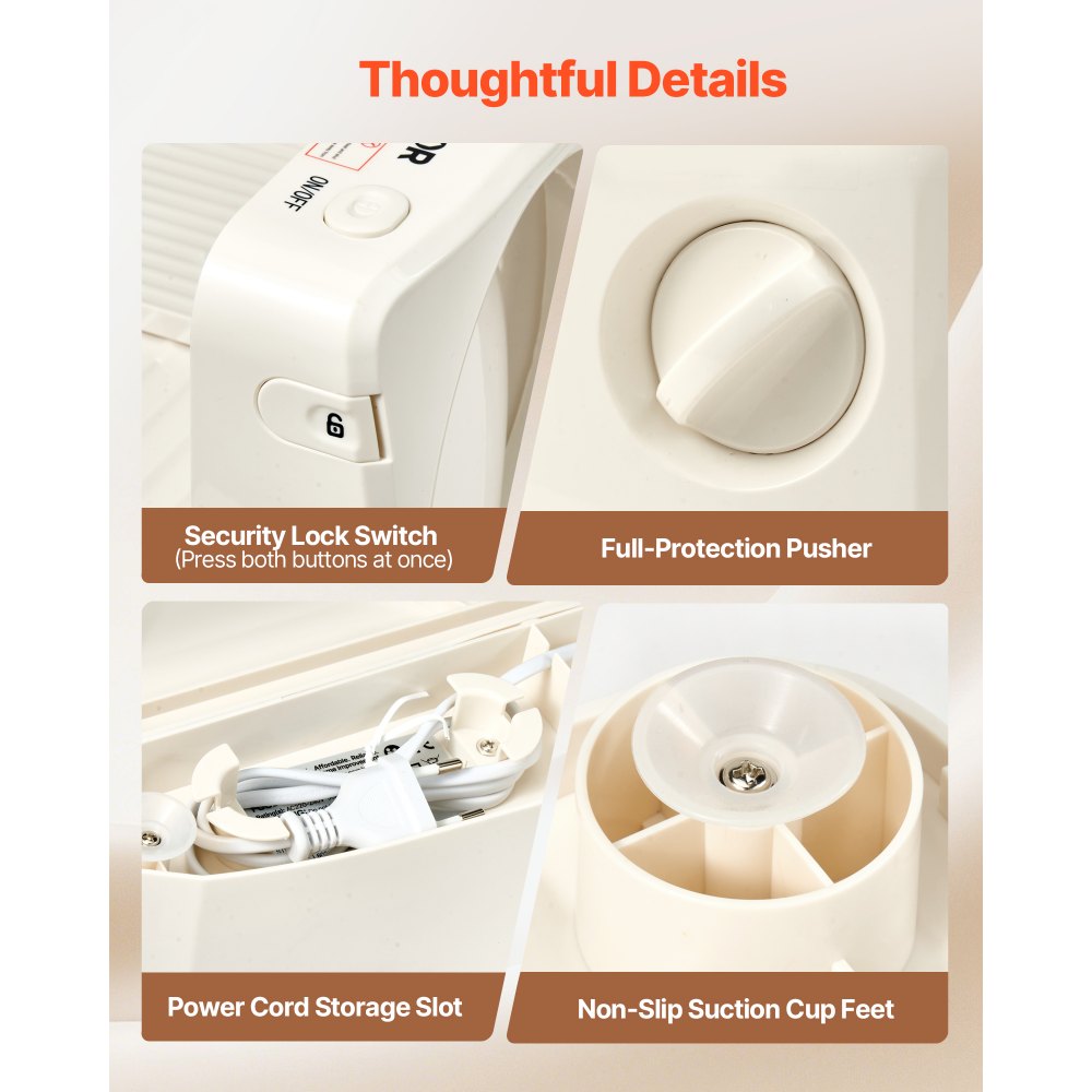 Protección de seguridad integral: La cortadora de carne cuenta con un bloqueo de seguridad, ventosas de goma resistentes y un empujador de alimentos con protección total, lo que garantiza un funcionamiento fiable y seguro durante su uso