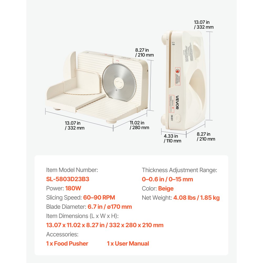 Fácil de desmontar y limpiar: Para mayor comodidad, la bandeja, la cuchilla y el empujador de alimentos de esta cortadora de fiambres se desmontan fácilmente para una limpieza a fondo, lo que facilita un mantenimiento rápido y sencillo después de cada uso
