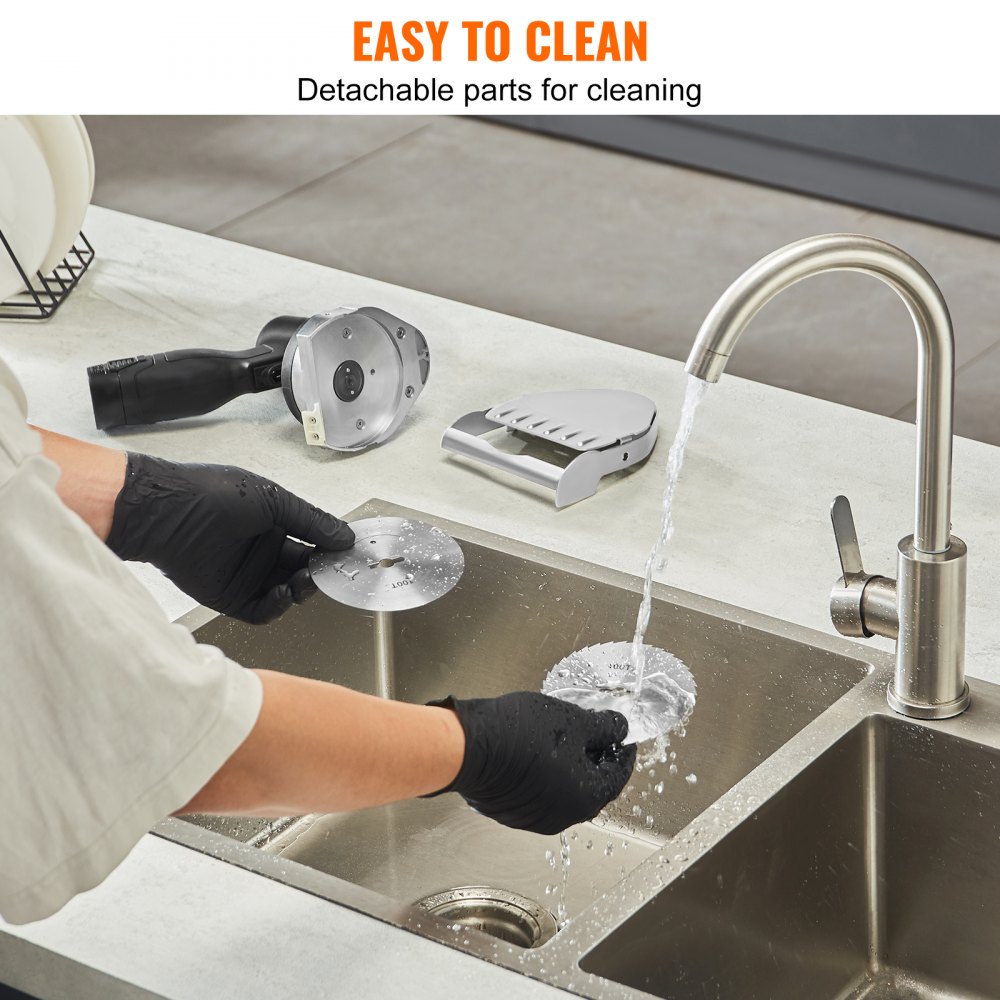 Desmontable: Las piezas que entran en contacto con los alimentos están fabricadas en acero inoxidable 5Cr15MoV de grado alimentario, conocido por su resistencia al desgaste y a la corrosión. Todas las cuchillas y accesorios son desmontables para facilitar la limpieza.