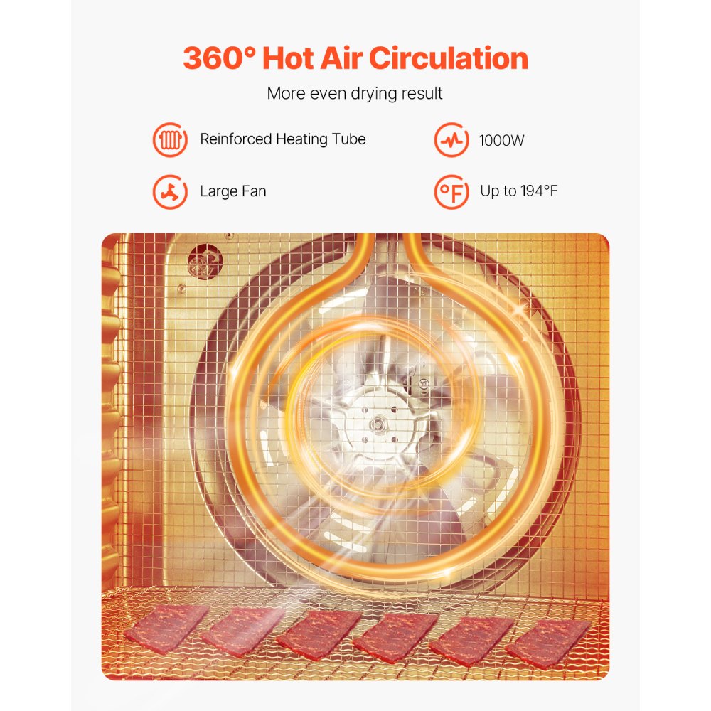 Ventana visible: Equipado con una gran ventana visible y una luz LED a prueba de explosiones incorporada, el proceso de secado de sus alimentos es claramente visible. El potente motor con cojinetes centrales garantiza que el ventilador funcione de manera suave y silenciosa, sin molestar a su familia