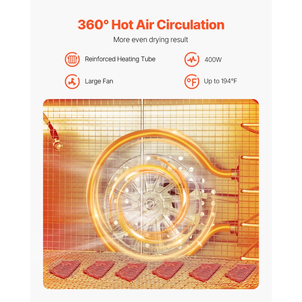 Ventana visible: Equipada con una gran ventana visible y una luz LED incorporada a prueba de explosiones, el progreso del secado de sus alimentos es claramente visible. El motor con cojinete de núcleo sólido garantiza que el ventilador funcione de manera suave y silenciosa, sin molestar a su familia