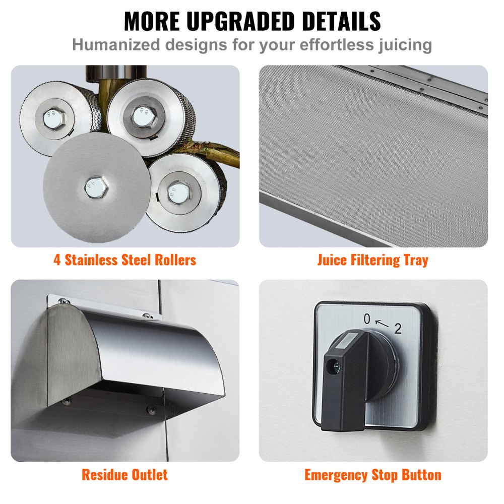 Extracción eficiente de jugo de caña de azúcar: La máquina de jugo de caña de azúcar VEVOR está equipada con un potente motor de 800 W, así como 4 fuertes rodillos de acero inoxidable, lo que hace que la extracción del jugo de caña de azúcar sea más eficiente y sin esfuerzo. La alta productividad de 300 kg/h maximiza la producción y la eficiencia del jugo.