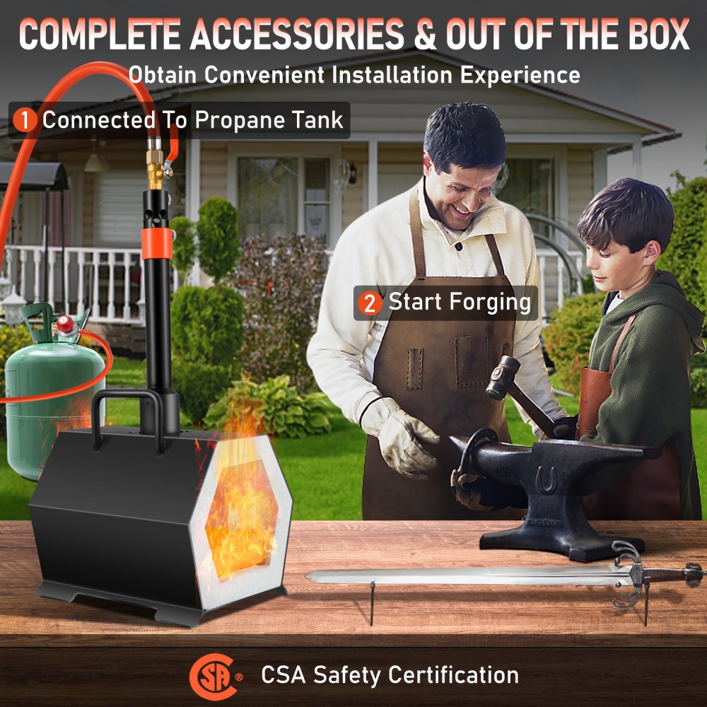 Comience a Forjar al Instante: Todos los accesorios esenciales están preinstalados para que pueda comenzar sin esfuerzo. El herrero está inmediatamente listo para usar después de desempacar. Después de conectarse al tanque de propano, puede comenzar su trabajo de hierro de inmediato. ¡Tan simple como eso!