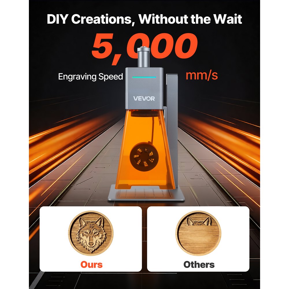 Alta velocidad de grabado: Gracias a la tecnología galvanométrica, este grabador láser portátil alcanza velocidades de grabado de hasta 5000 mm/s y de previsualización de hasta 32.000 mm/s. Su avanzada tecnología láser ofrece un excelente rendimiento de corte