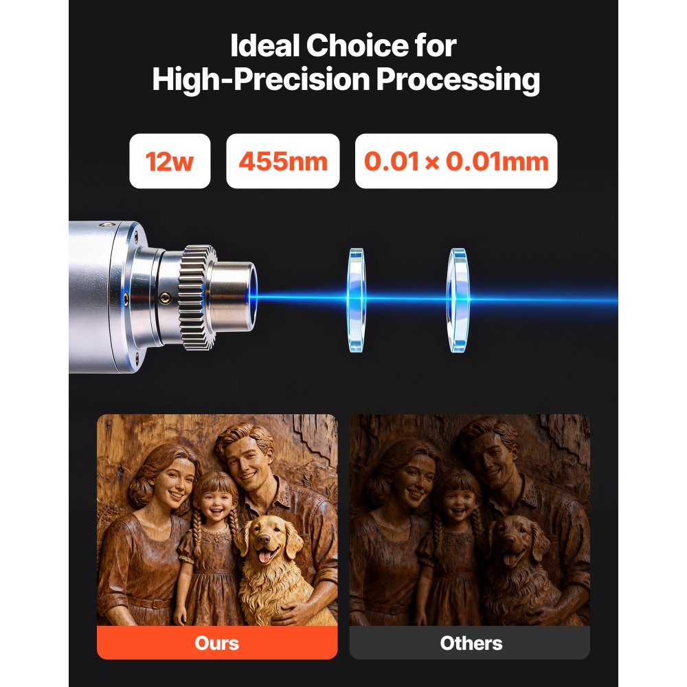 Grabado de precisión: Nuestro grabador láser portátil cuenta con un láser azul de 12 W con un punto de 0,01 x 0,01 mm, ideal para líneas finas y bordes lisos. El enfoque se ajusta rápidamente mediante la perilla, lo que lo hace ideal para diseños de alta precisión
